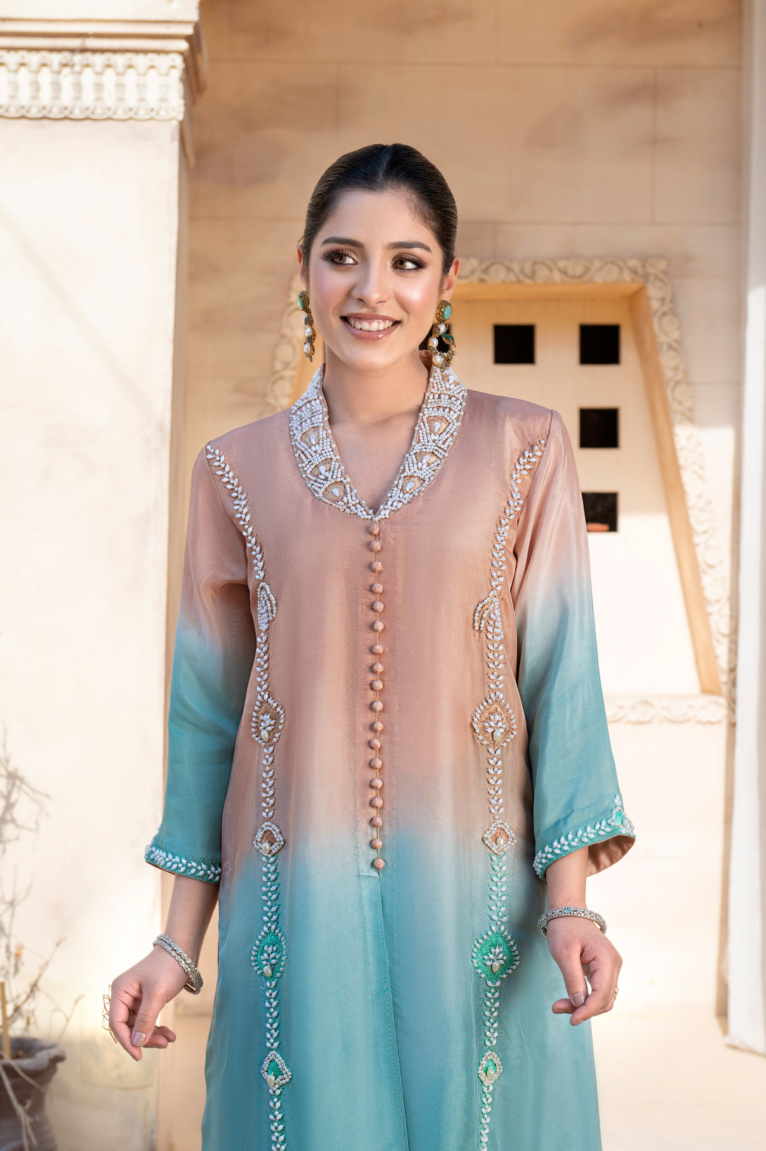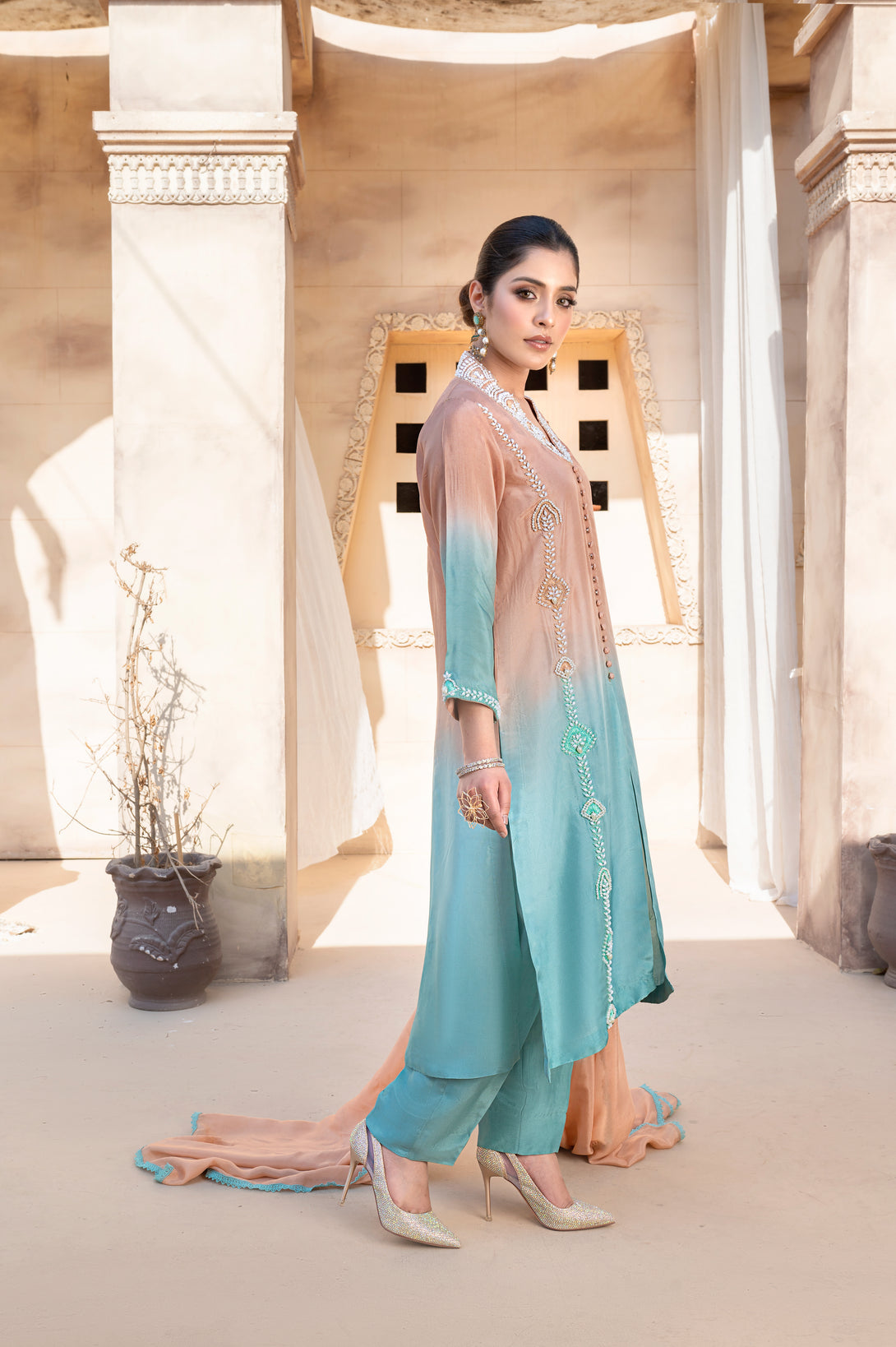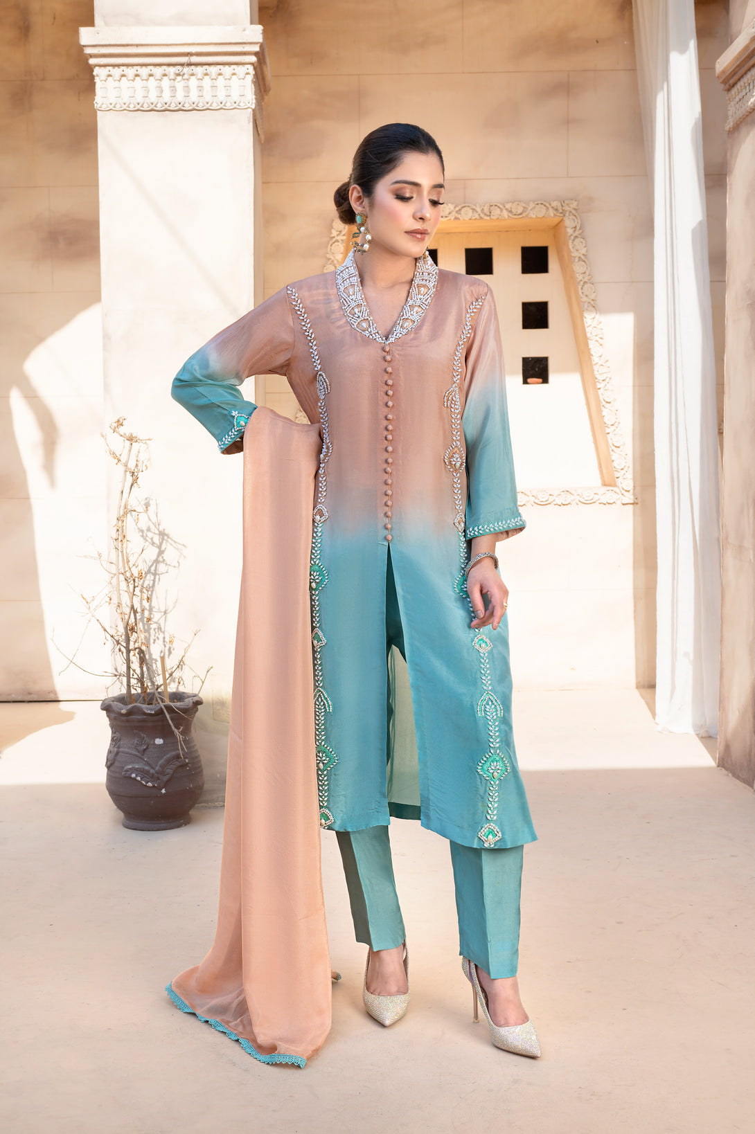 Abresham is a timeless statement of grace, crafted from luxurious two-tone silk in a chic front-open shirt silhouette. The shirt is delicately embellished with handwork of sequins and pearls all over, adding a soft shimmer and elegant texture that enhances its refined appeal.