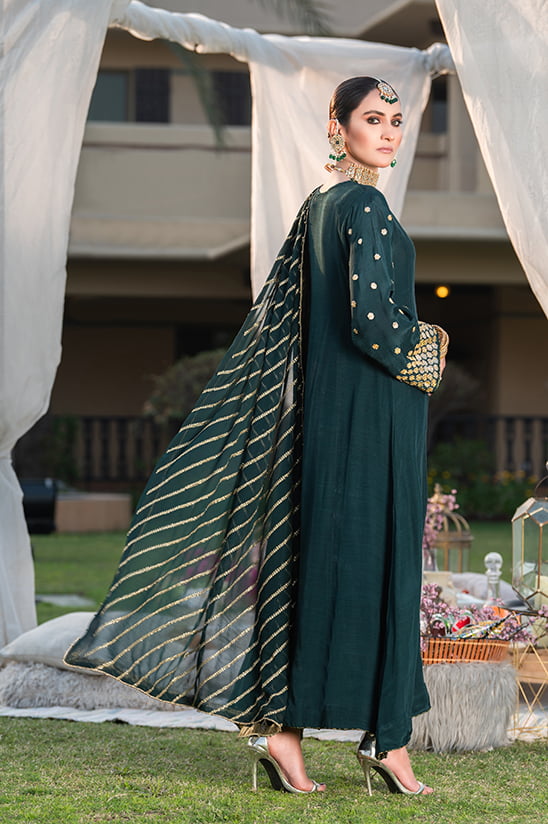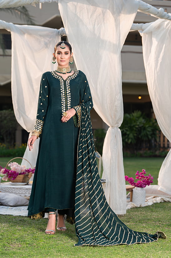 Copper Gold Panni Gotta Hand Work blooms with Kaliyan and Jamawar Facing in this emerald green Raw Silk Canvas. Style as a flowing maxi for an unforgettable festive look. This Beautiful hand crafted piece is paired with Chiffon Dupptta having Copper Gold embroidery and Sitara that enhances the galore of this intrinsic dress.Copper Gold Panni Gotta Hand Work blooms with Kaliyan and Jamawar Facing in this emerald green Raw Silk Canvas. Style as a flowing maxi for an unforgettable festive look. This Beautiful hand crafted piece is paired with Chiffon Dupptta having Copper Gold embroidery and Sitara that enhances the galore of this intrinsic dress.