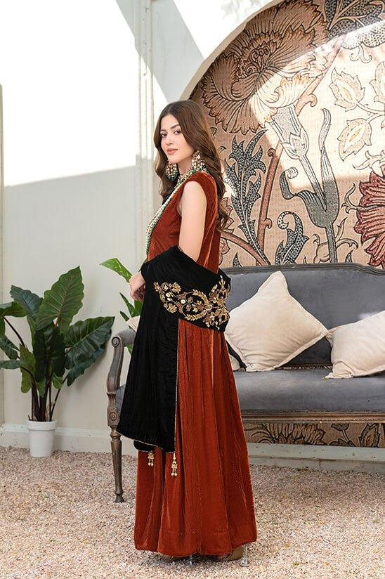 This elegant black velvet shawl is adorned with intricate handwork, featuring delicate Kora and Dabka embroidery, Gota embellishments, and glistening stones. The shawl is further enhanced with a luxurious Jamawar border, adding a touch of opulence. Tassels on all four sides complete this exquisite piece, making it a perfect accessory for special occasions, exuding sophistication and grace.