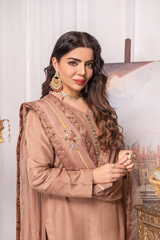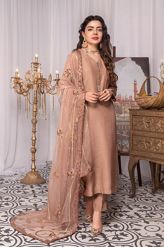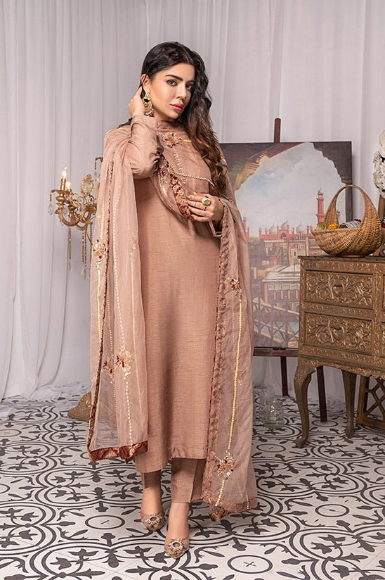 A gracefully elegant and contemporary composition is portrayed on this exquisite ensemble rendered in an appealing golden brown shade. A pure example of timeless sophistication, this three-piece consists of a plain straight raw silk shirt classically enriched with the Adornments of Kundan button near the neckline which comes with matching raw silk straight pants in beautiful golden brown color. Paired with a detailed organza dupatta having enchanting handwork of Pearls and Sitara French Knot and traditional Jamawar Facing on all sides, this dress is perfect to stand out in your Eid Gatherings.
