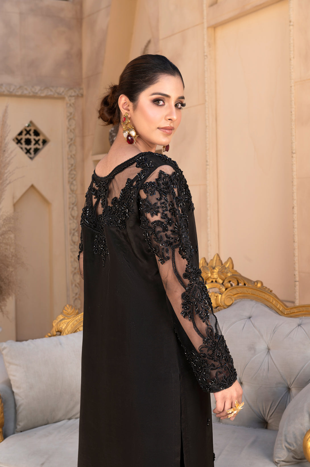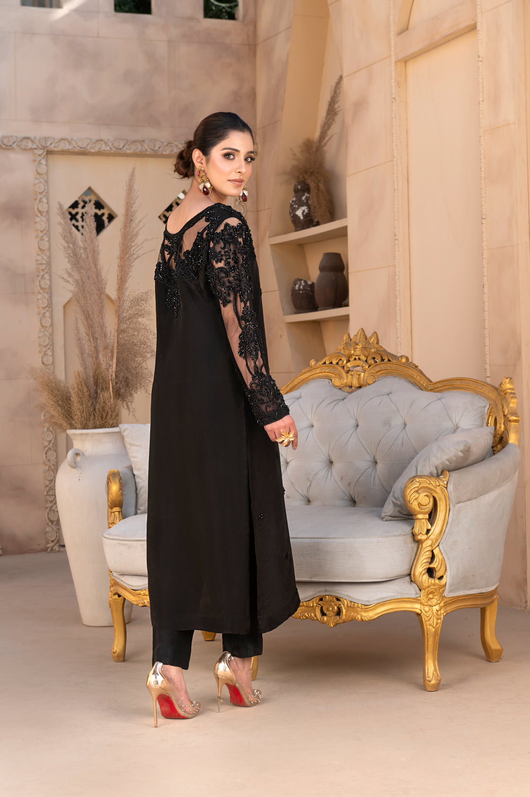 An ode to refined elegance, Inayat is crafted from luxurious silk and elevated with intricate detailing. The shirt is adorned with handwork of cut dana on lace across the shoulders and neckline, while the lace sleeves are further enhanced with delicate hand embellishments, adding subtle sparkle and artistry.