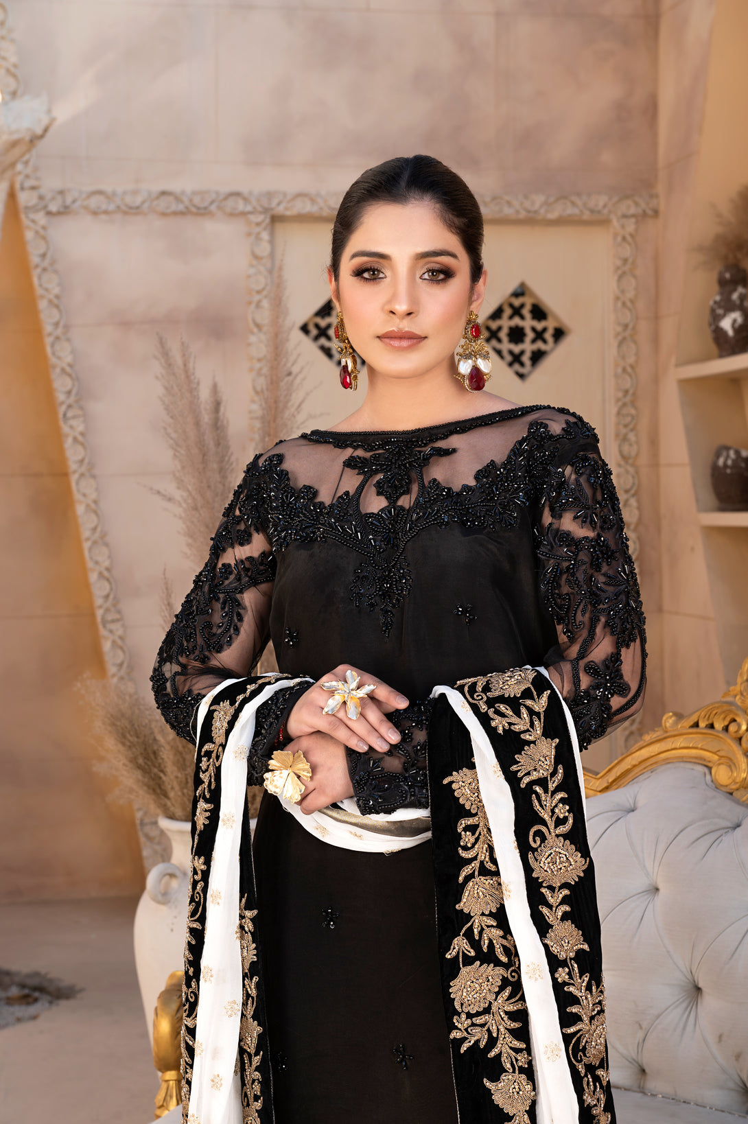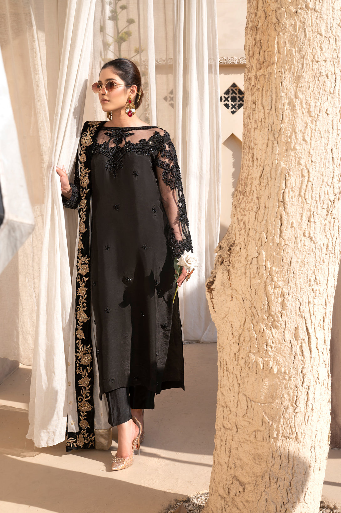 The ensemble is paired with sleek straight pants, keeping the silhouette graceful and timeless. Completing the look is a flowing chiffon boti dupatta, edged with a velvet border all around, exquisitely finished with copper aari embroidery for a regal touch.
