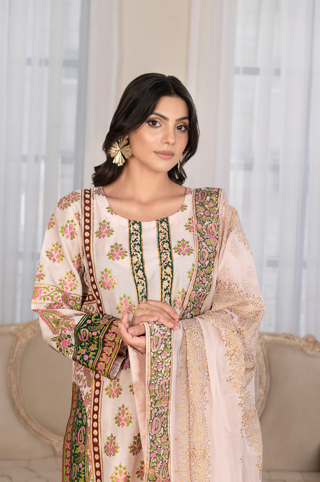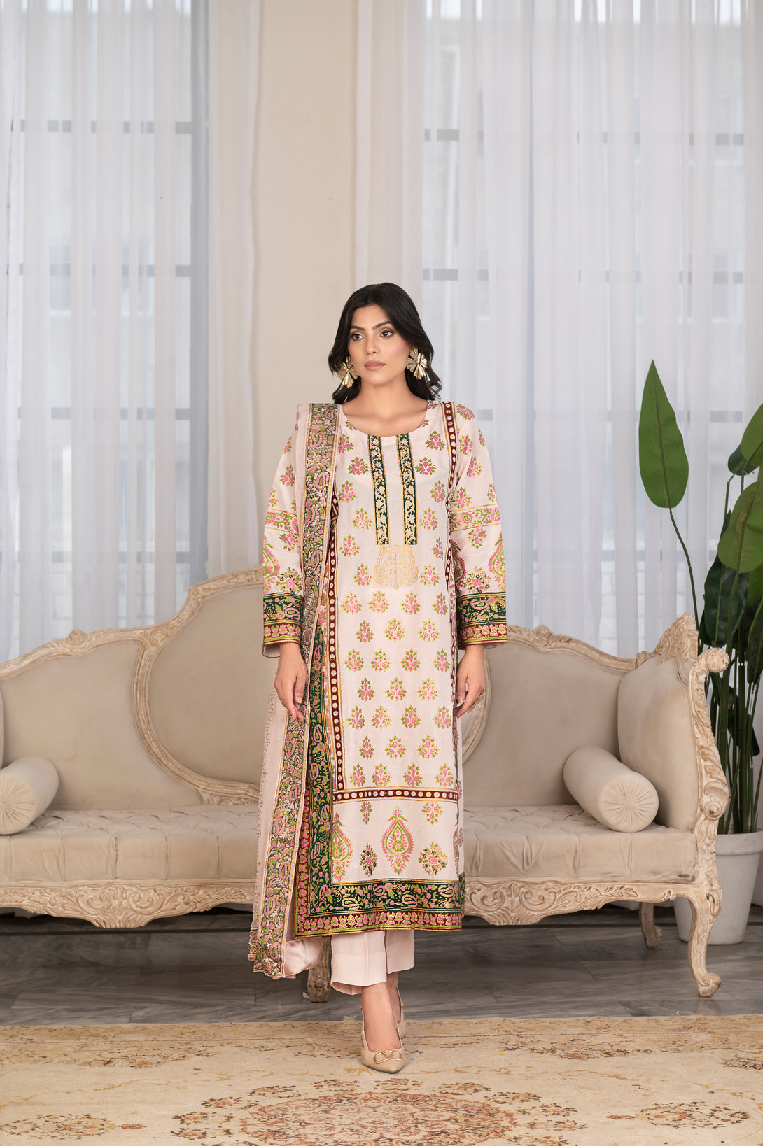 It is paired with straight silk pants for a refined silhouette. The ensemble is completed with a soft chiffon dupatta, beautifully adorned with a block print border all around and delicate motifs spread across the dupatta, finished with a luxurious Shamoos silk edging for a polished look.