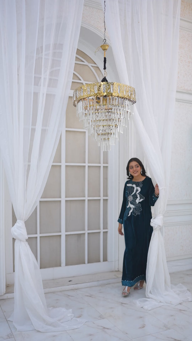 Crafted for Evenings Filled with Grace. This velvet kaftan is the definition of refined beauty—subtle pearl shimmer, intricate stone embellishment, and the soft elegance of shamoos finishing. Designed for women who value timeless charm, it adds just the right touch of glamour for winter nights.