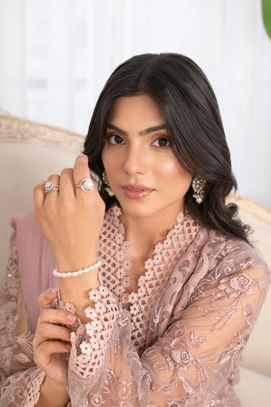 It is paired with a classic farshi shalwar, bringing a traditional flow and elegance to the silhouette. Completing the ensemble is a lightweight chiffon dupatta, finished with a lace border all around, offering a refined and graceful drape.