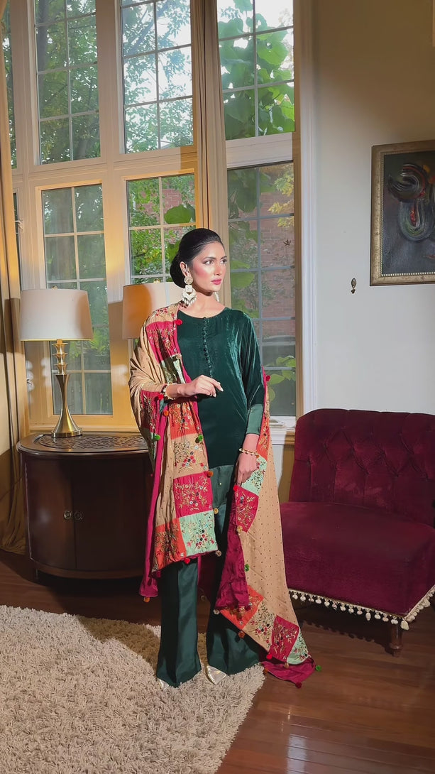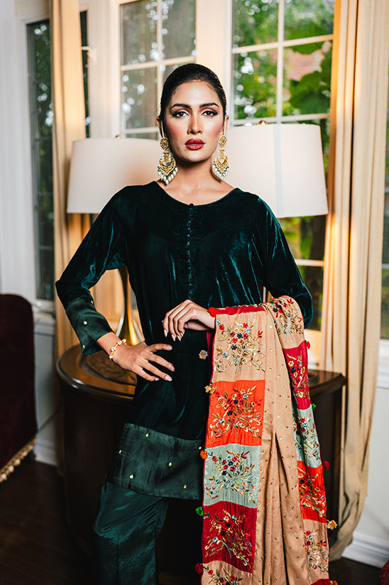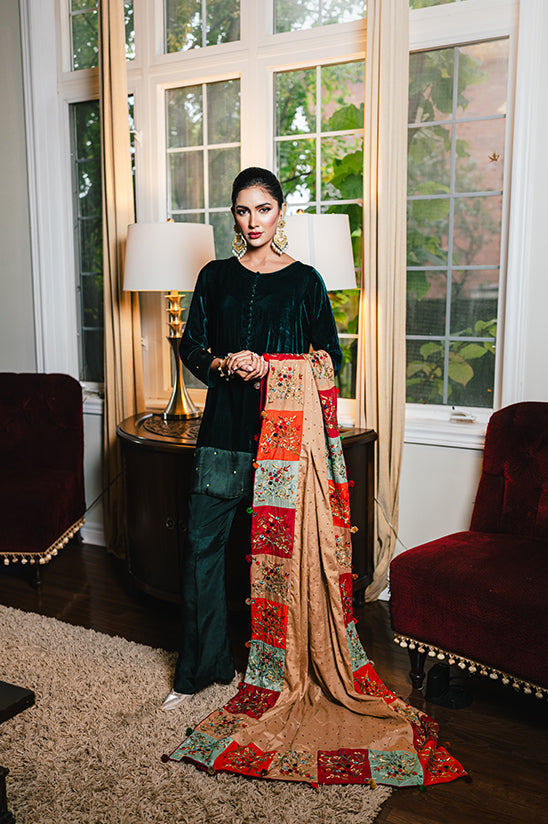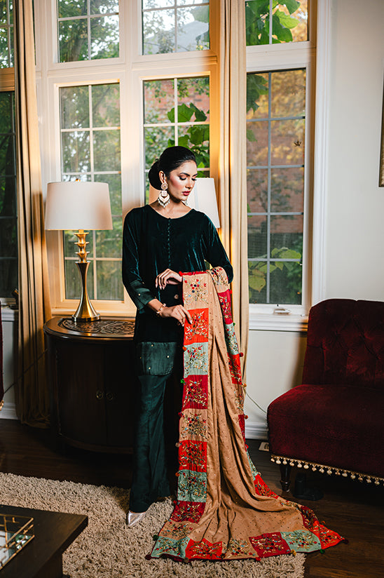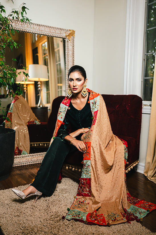 Perfectly versatile, it pairs beautifully with our velvet co-ord sets for a regal evening look. For a personalized touch, the Nouran Beige Shawl can also be customized according to your size and style.