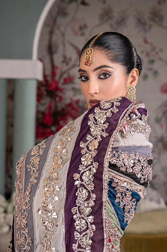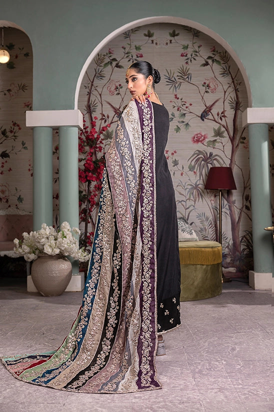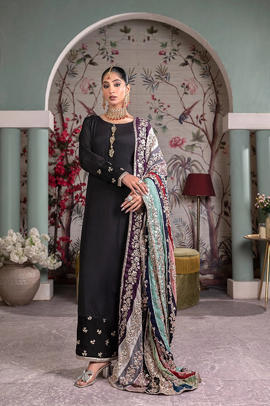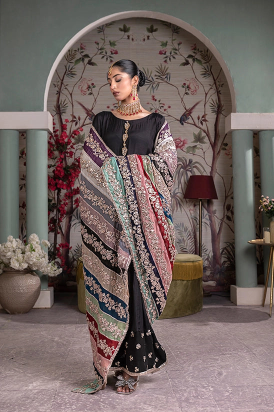 Indulge in the allure of this black raw silk kalidar accentuated with delicate button pati detailing along the neckline. Paired with matching raw silk trousers. Complete the look with a vibrant multi coloured chiffon dupatta adorned with handwork of gotta and finished with tissue and silk lining. It’s a fusion of traditional craftmanship and modern sophistication.