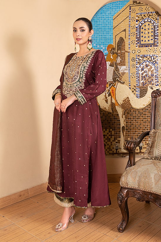 A Long maxi dress with beautifully ornamented and artfully arranged kora dabka, tilla and stone handwork on a gossamer raw silk base rendered in dark maroon in “shab e roz” . This intrinsically beautiful shirt is paired with diaphanous organza dupatta with jamawar finishing and a jamawar trouser embellished with a lace at bottom. This outfit is a perfect pick for evening festivity.