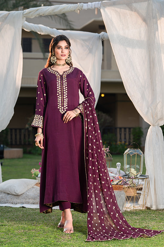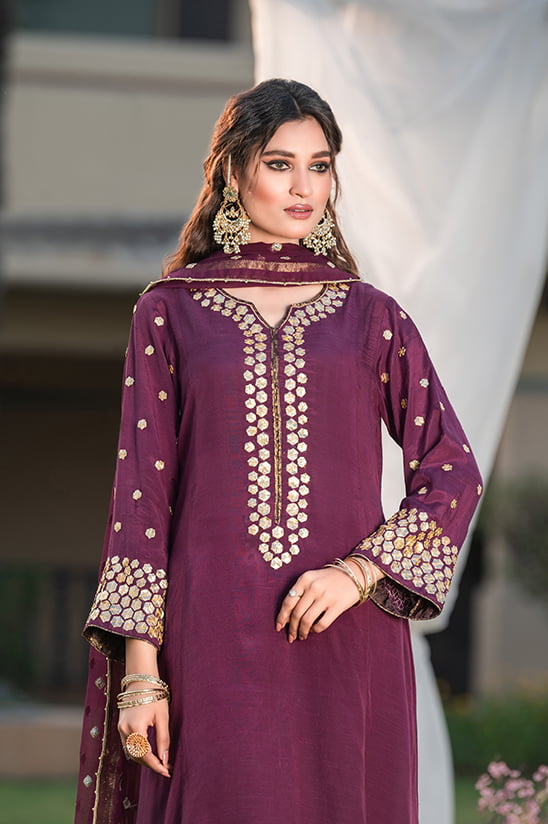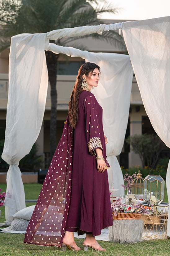 In an elegant ode to tradition, a Raw Silk Shirt is intricately embellished with copper Gold Panni Gotta Hand Work with Kaliyan and Jamawar Facing. This flowing maxi is complimented with a Chiffon Dupptta having Copper Gold embroidery and Sitara. Make this festive season special with Yaqoot from our Riwaj Collection.