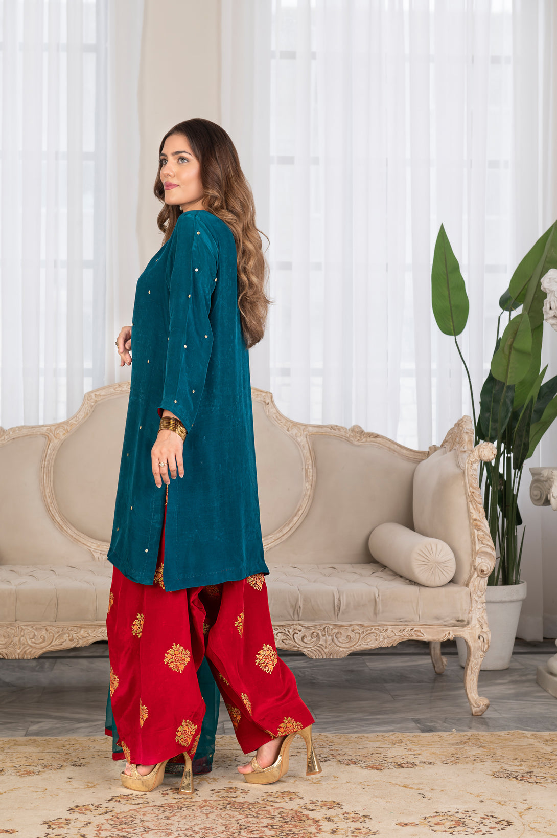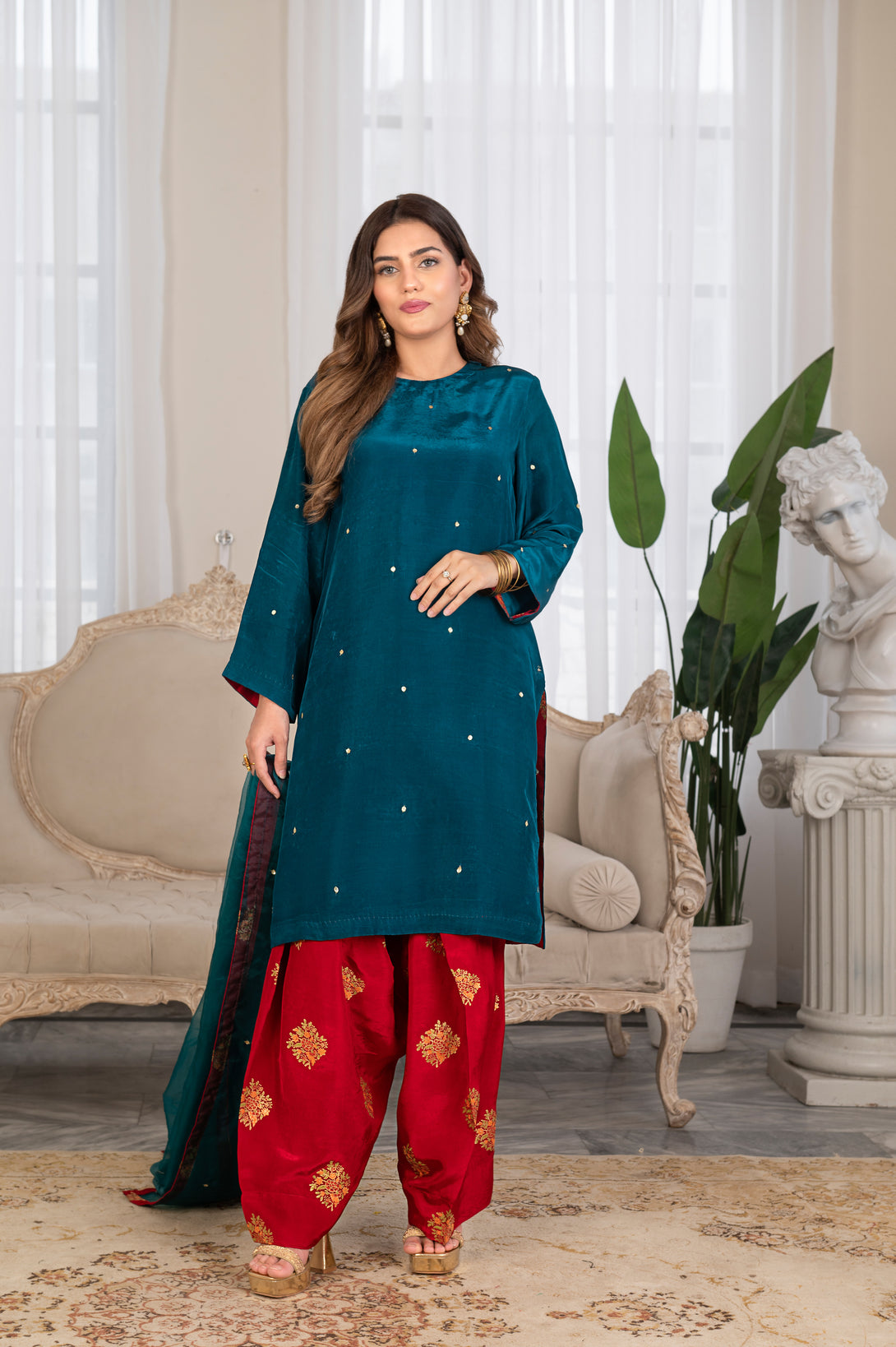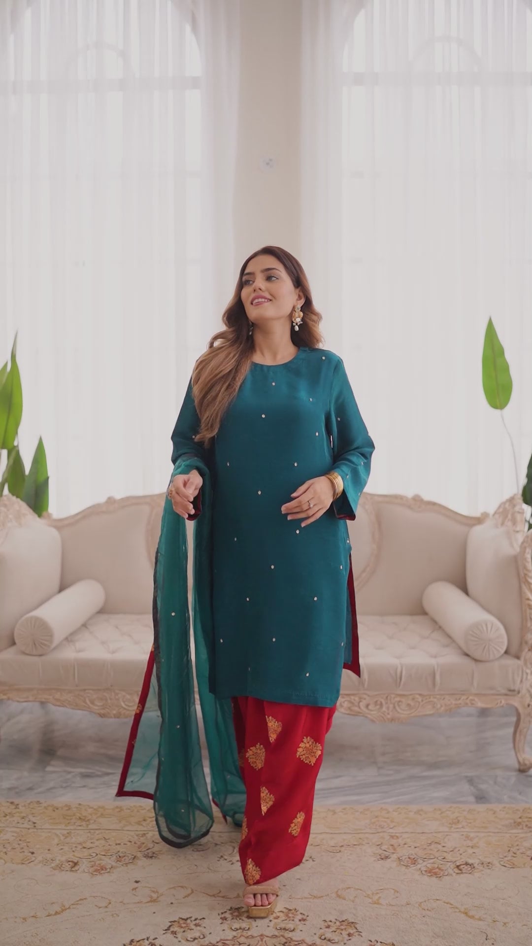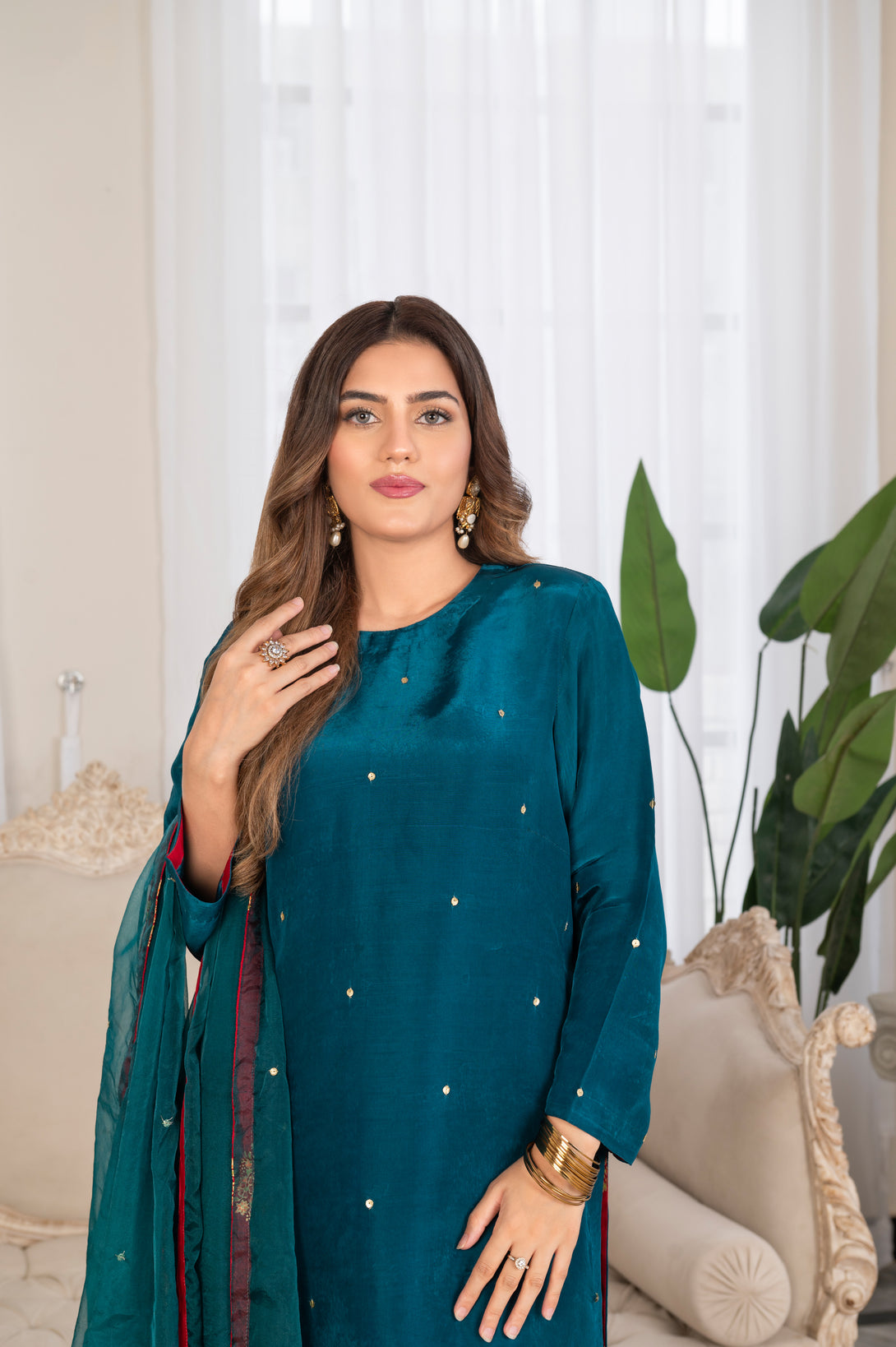 Zureya is a masterpiece of timeless elegance, blending intricate craftsmanship with regal charm. The silk shirt is delicately embellished with handwork of sitara, adding a graceful sparkle that enhances its refined silhouette.